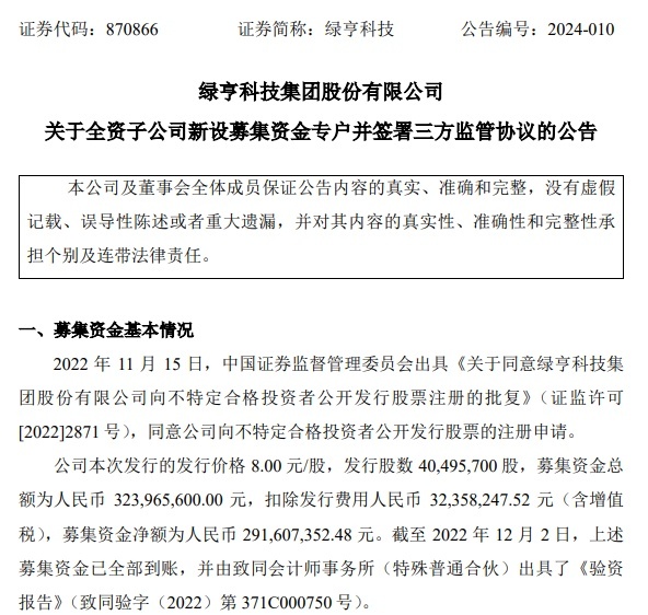 绿亨科技:全资子公司新设募集资金专户,募资总额3.2亿元